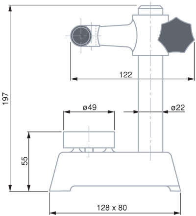 С круглым стальным измерительным столом. Измерительная рука с зажимным отверстием диаметром 8 мм, без тонкой регулировки.Общий вылет: 48 мм.